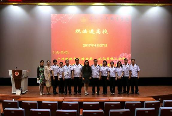 来自鳌头国税分局的罗洪亮则向到场师生介绍了税种种类、发票管理以及税务的登记、申报的方式和途径。来自从化区地税局征收管理科郭丽春讲解涉税法律法规的相关内容 。来自广州市中区稽查局检查三科的马依喆以“税收管理及风险防范”内容的精彩讲解为一天的宣讲活动画上了圆满的句号。