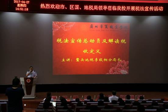 下午14:40分,广州市中区稽查局、从化区地税局、鳌头国地税局领导和专家来到广州华夏职业学院电影院,面向两百多名师生,专题进行有关社保、个人所得税、大学生就业创业税收优惠政策等相关知识的讲解。鳌头地税分局巢南星副局长倾力主持宣传活动。